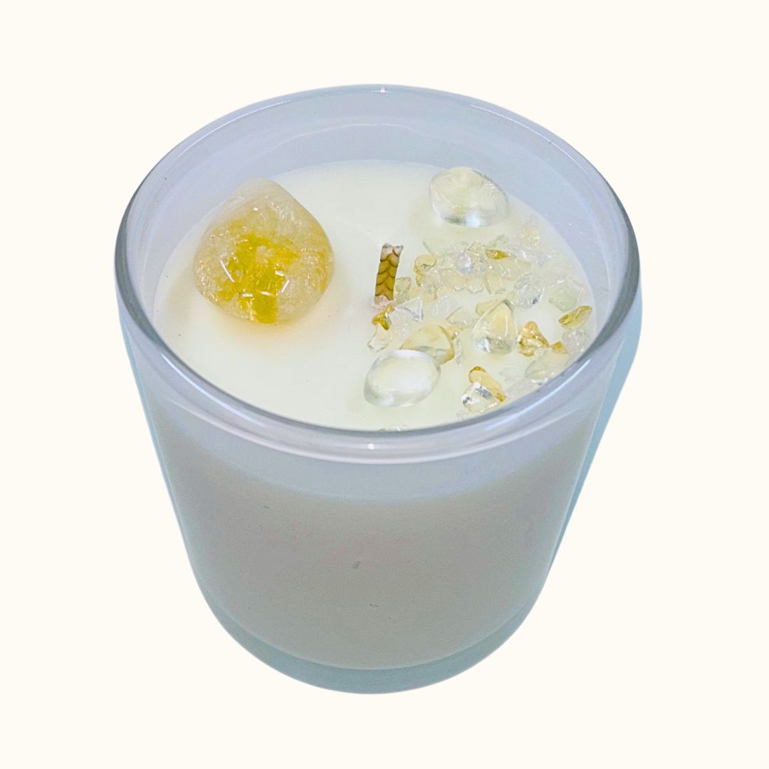 Crystals are chosen intuitively. Small crystals sprinkled on top of the candle may vary from candle to candle and may differ from those pictured.