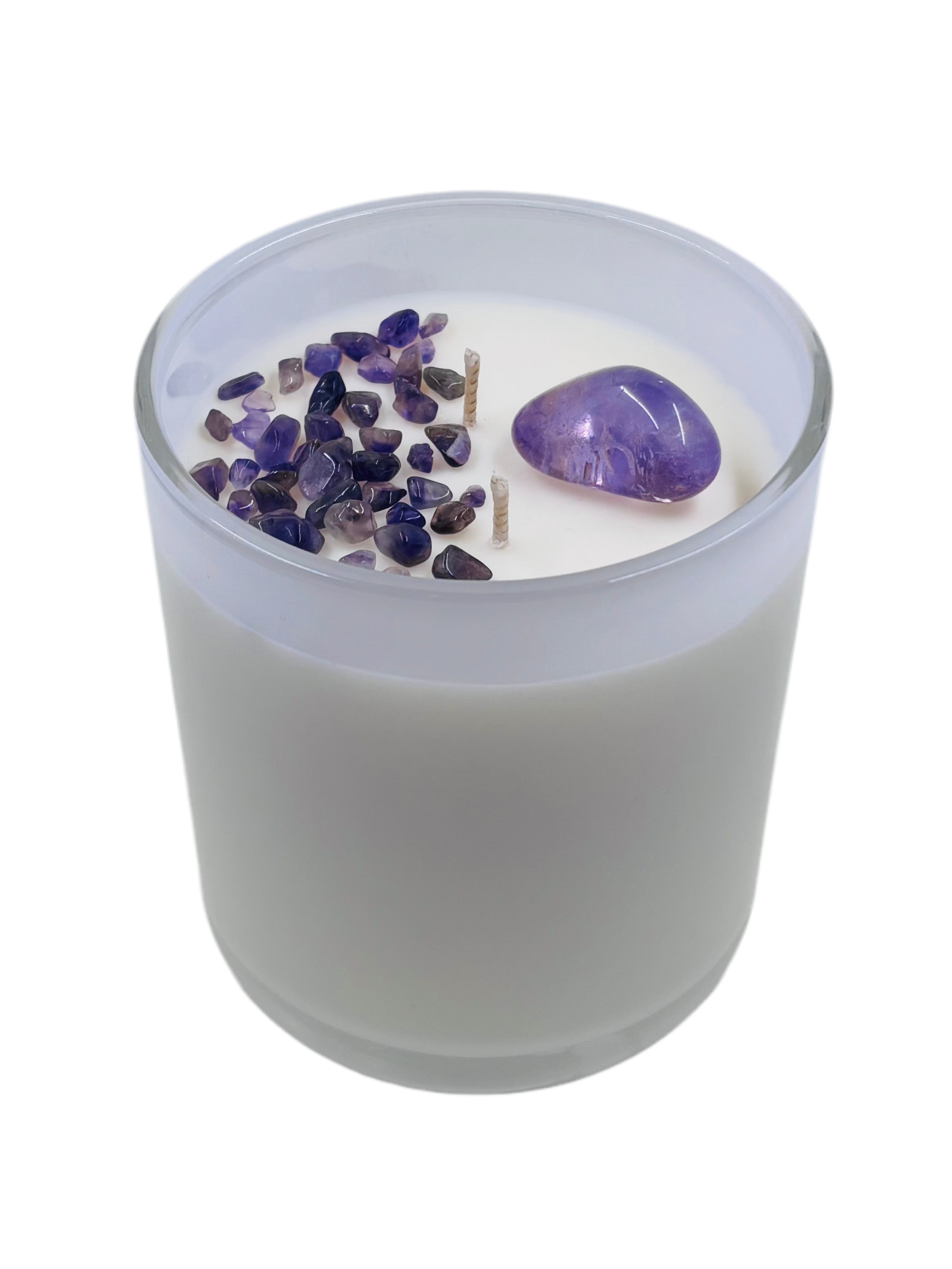 Crystals are chosen intuitively. Small crystals sprinkled on top of the candle may vary from candle to candle and may differ from those pictured.