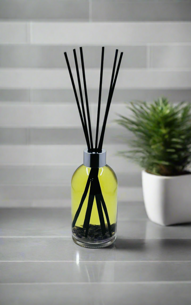 200ml clear diffuser containing 20 grams of crystals. Each diffuser includes 6 x 100% polyester black fibre diffuser sticks which are 3mm in diameter and 250mm in length. Our diffuser sticks provide strong liquid absorption for great scent throw