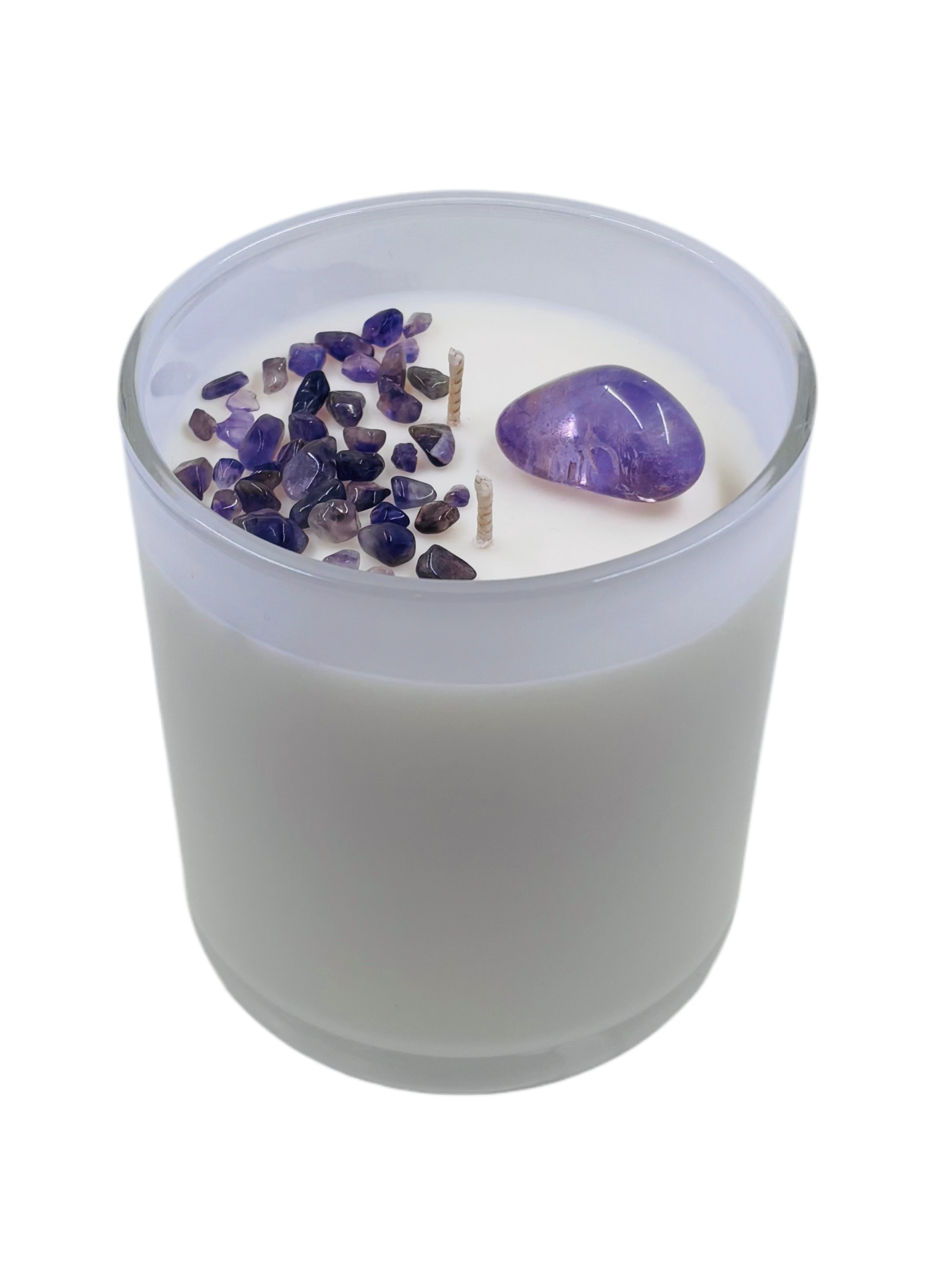Crystals are chosen intuitively. Small crystals sprinkled on top of the candle may vary from candle to candle and may differ from those pictured.