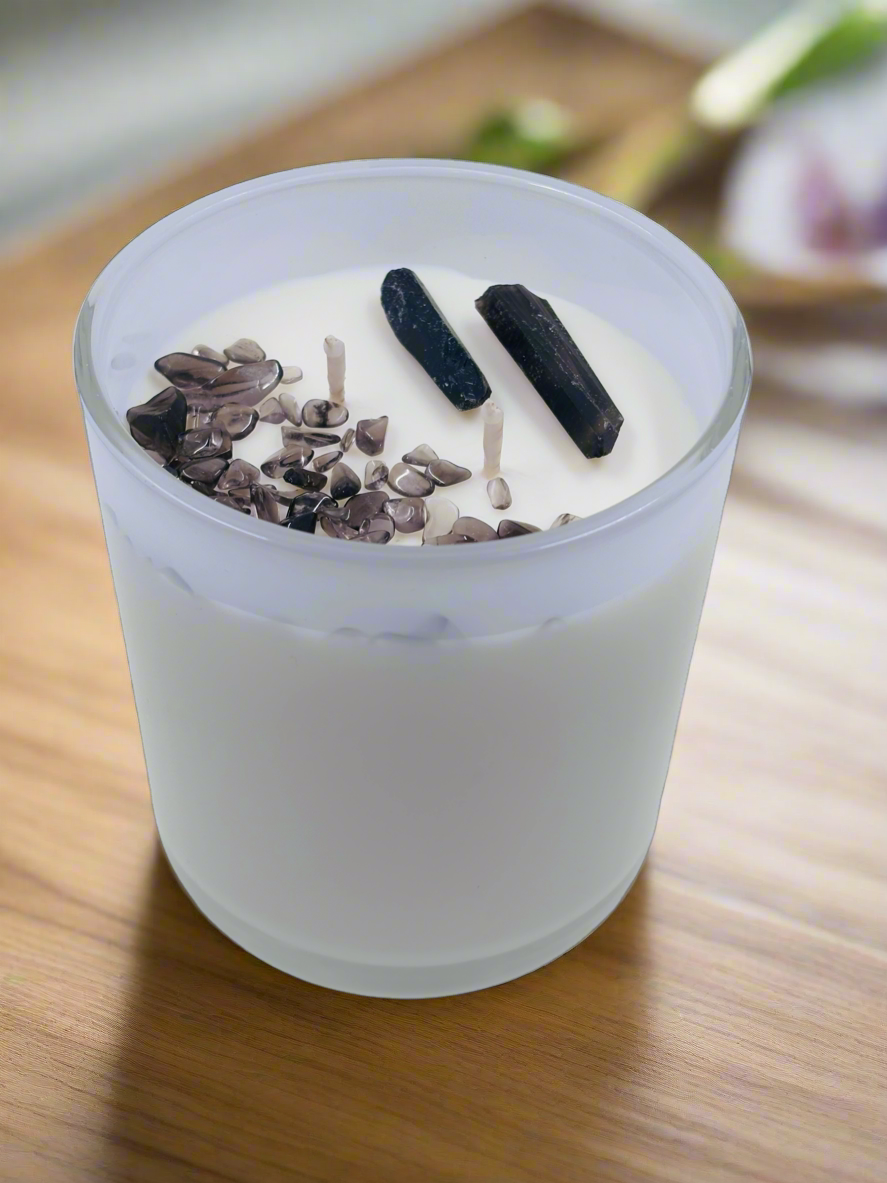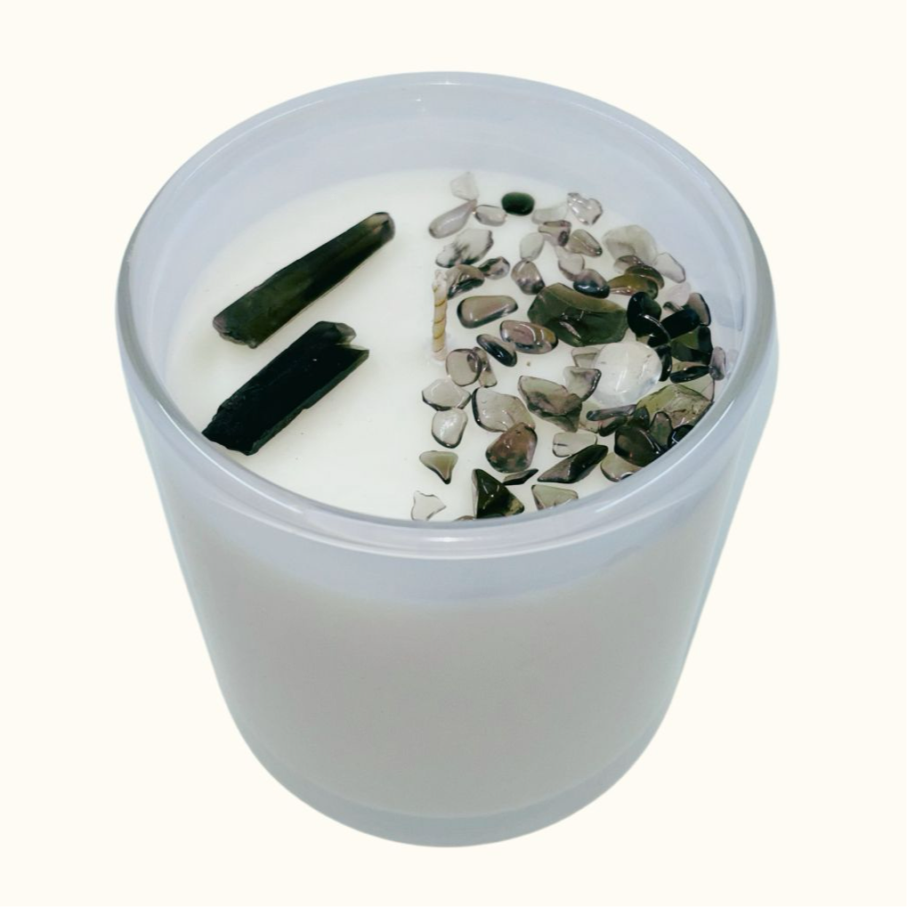 Crystals are chosen intuitively. Small crystals sprinkled on top of the candle may vary from candle to candle and may differ from those pictured.Includes our signature Crystl etched wooden lid and luxury gift box with candle care.